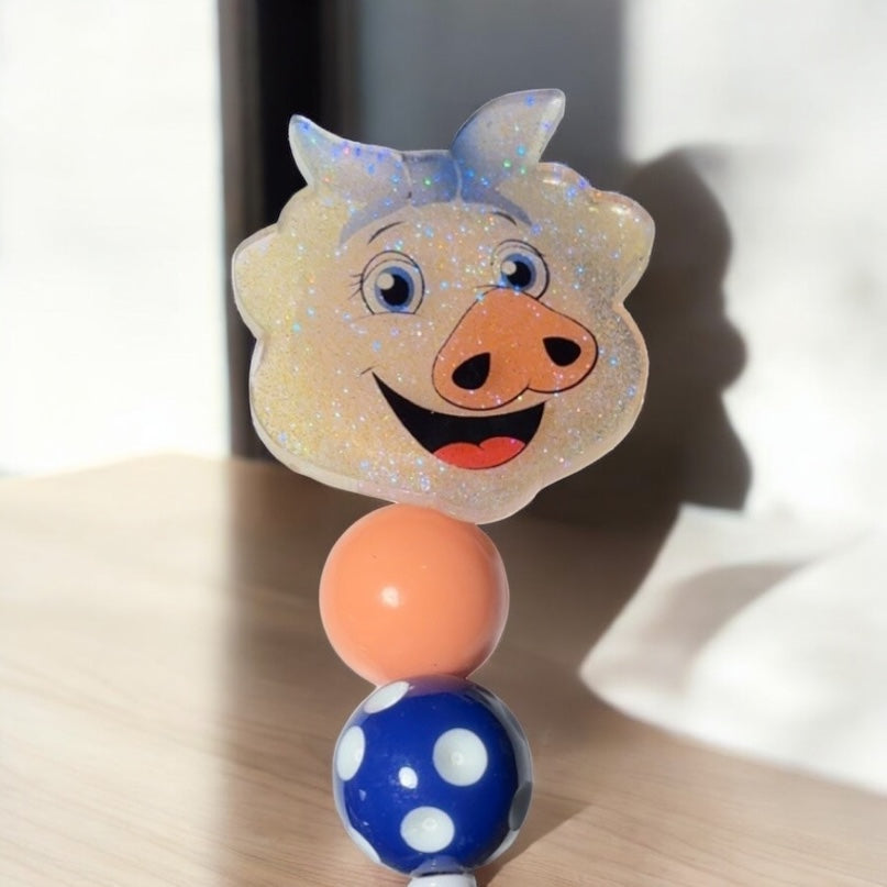 Pig with blue bow and beads alligator clip
