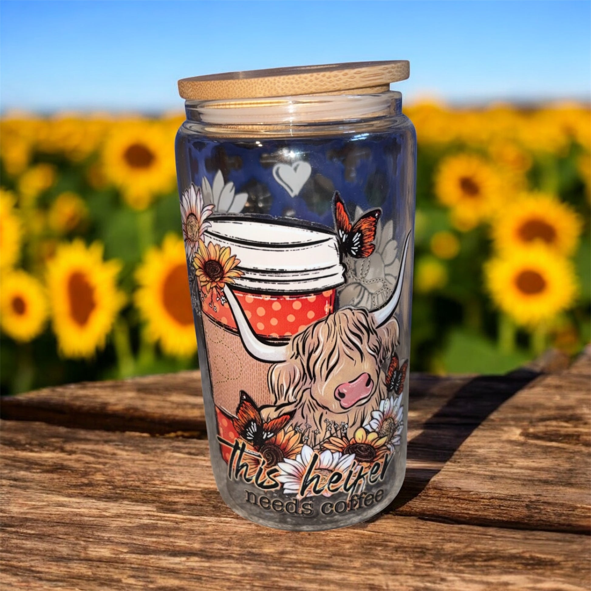 highland cow with flowers and coffee